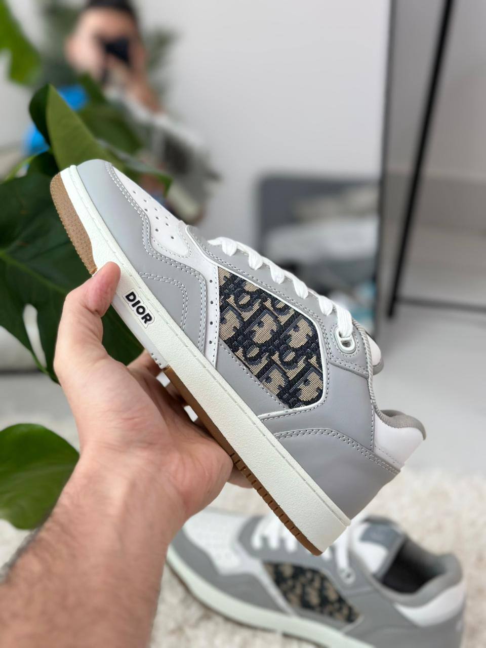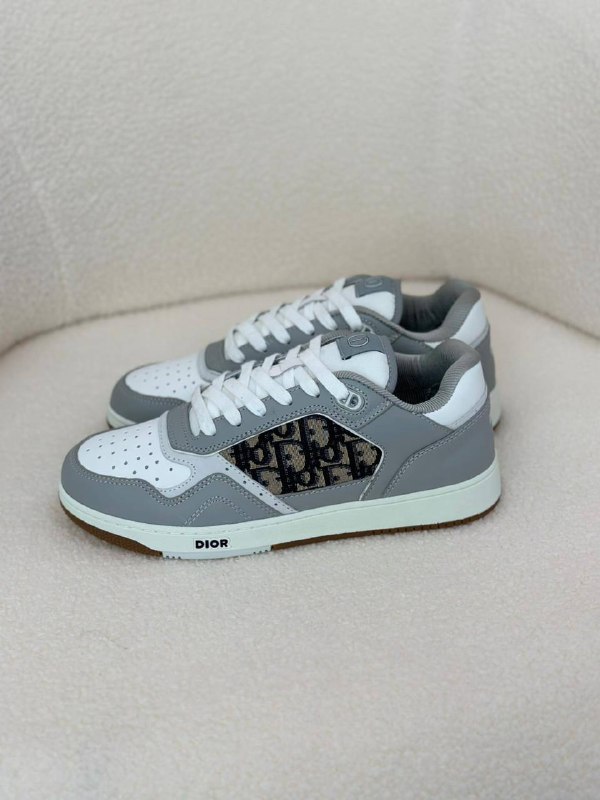 - المواد: الجزء العلوي مصنوع من جلد العجل الأملس باللونين الرمادي والأبيض، مع لوحات جانبية قماشية مزينة بنقش “Dior Oblique” الجاكار باللونين البيج والأسود.