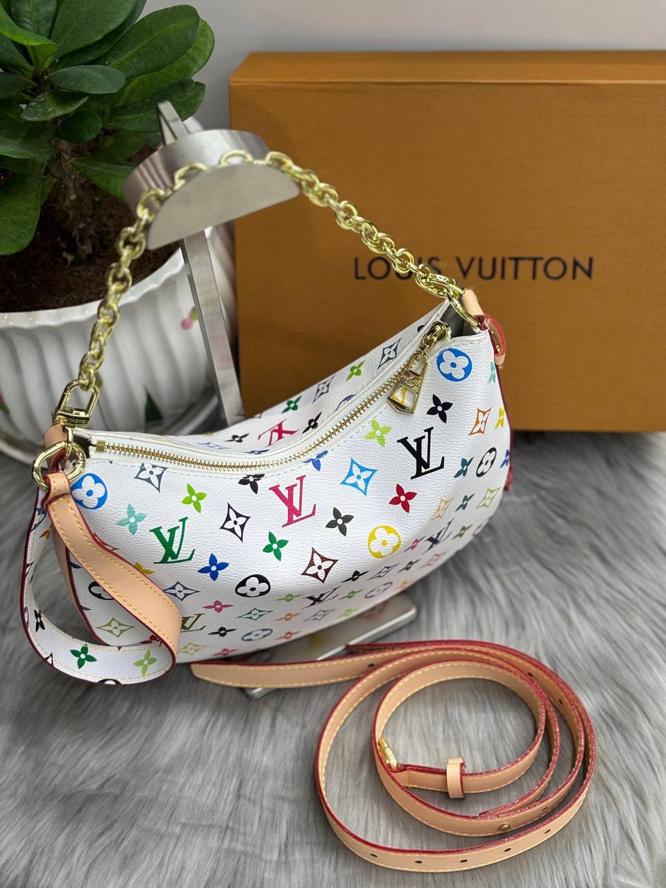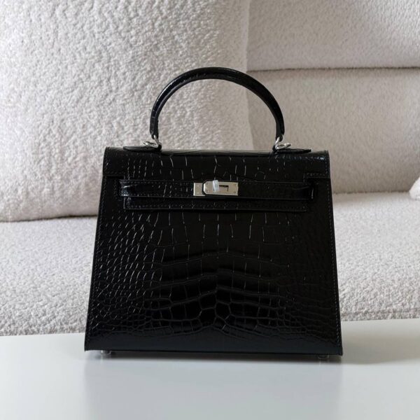 - التصميم: تتميز الحقيبة بشكلها المدمج الذي يلتف حول الجسم وحزام سلسلة ذهبي اللون يمكن حمله على الكتف، بالإضافة إلى حزام جلدي طويل قابل للتعديل والفصل لحملها كحقيبة كروس بودي.